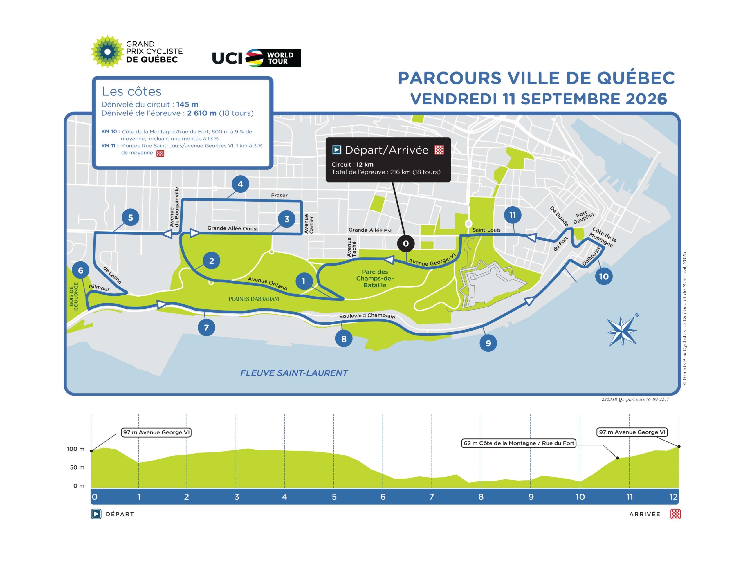 Le circuit du Grand Prix Cycliste de Québec conviendra particulièrement aux puncheurs et aux habitués des pentes raides. Il sera parcouru 18 fois avec une arrivée en côte sur les emblématiques Plaines d’Abraham.